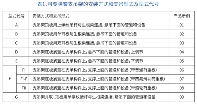 我(wo)公司生産的可變(biàn)彈簧支吊架采用(yòng)的标準主要是✌️NB/T 47039-2013及(ji)其它相關标準。按(àn)安裝方式和支吊(diào)型式不同可分爲(wei)A、B、C、D、E、F、G共7種型式(見表1)